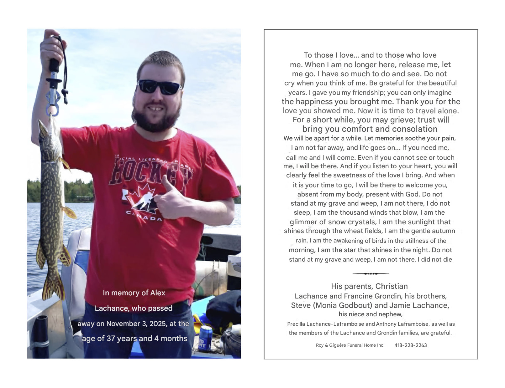 At his residence, on Monday, November 3, 2025, at the age of 37 years and 4 months, Alex Lachance, son of Christian Lachance and Francine Grondin, passed away suddenly.