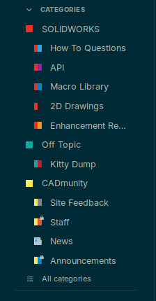 @JimSculley Posted before but got wiped in the final migration. Not sure if its diffcult to implement or if everyone thinks it worth it, but it would be nice if sub-categories were indented.