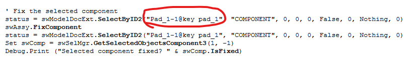 forget it. this is such a pain in the butt. all i want to do is fix the part that was just inserted in the assy. but you cant do that in one line of code. it seems you have to jump through hoops to do any one thing in here.. i’ve been at this for three hours now and getting nowhere. now i remember why the last time i wrote a macro in sw was the last time.