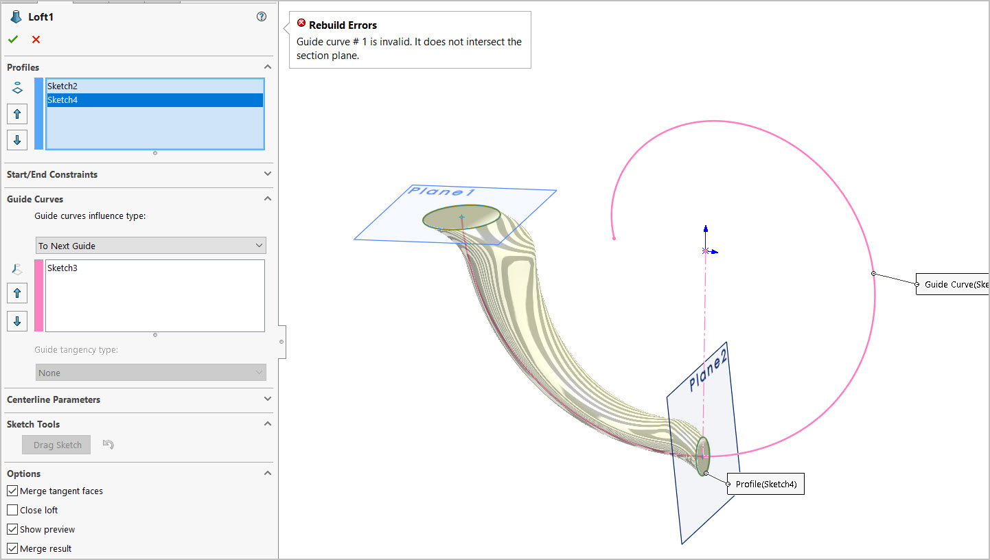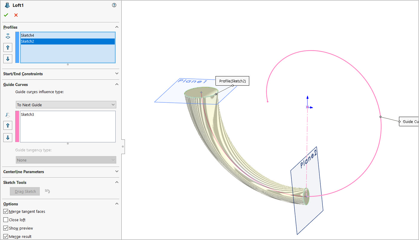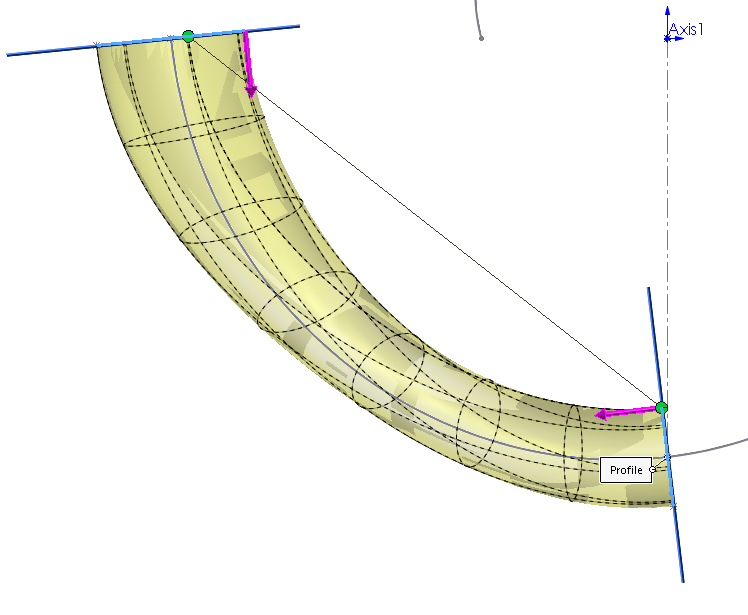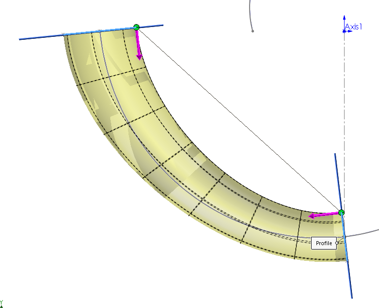 If you turn on ‘Mesh preview’ in the Curvature Display section of the loft property manager you will see the effect that dragging the handles has. The U-V curves will align themselves to the location of the loft handles, which will cause the intermediate loft profiles to turn. When they are close to aligned you get this: