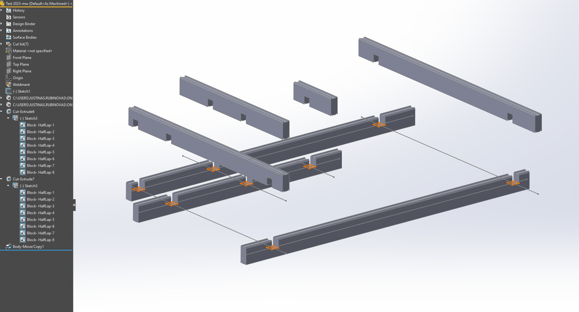 Applying Smart Component to each joint would be a nightmare. And they can’t really be patterned. Perhaps it could be done via assembly-level pattern and then using Cavity to cut out all the patterned joinery pieces from the multibody beams part, but I can already imagine how much would SW struggle with such a heavy operation.