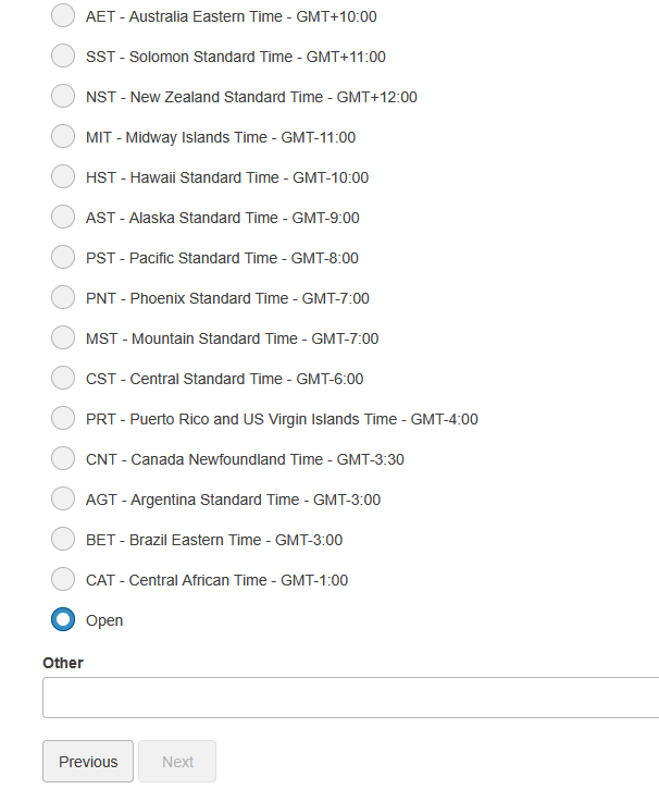 For me, there were only the 2 questions. Maybe if I had picked something other than âopenâ for the time zone more questions followed.