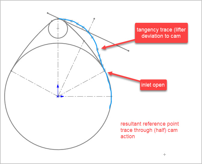 You got it exactly. Tangency shifts from the cam flank to the cam nose. Its ‘on’ the cam at the beginning of lift and at 12:00 position on nose, but it creates some deviation shape in between. I was trying to mark positions at incremental angles, eventually blue line.