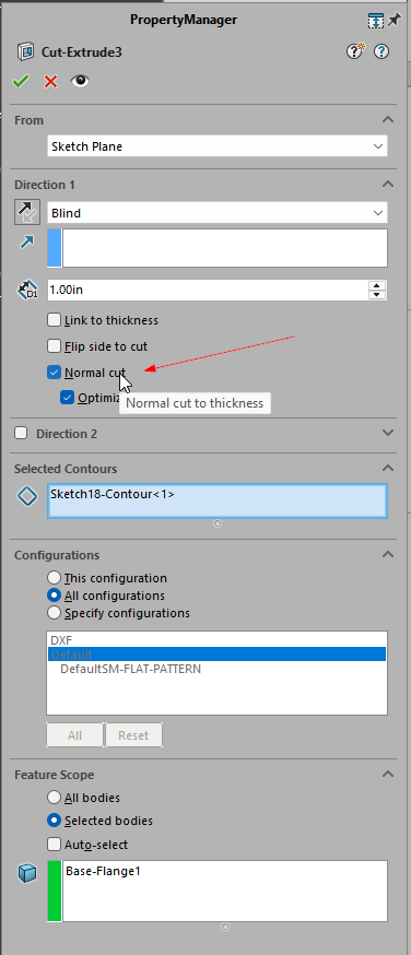 I’m not talking about the Normal Cut feature, I’m talking about the Normal Cut check box/option in the Extruded Cut feature property manager.