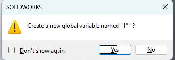 I get this all the time. The problem occurs when I think I’m typing somewhere, like a spreadsheet or web address, but SW still has the focus and my typing gets entered in the dimension value. The point is that if you enter something SW doesn’t recognize as a number or equation, it will offer to create a variable.