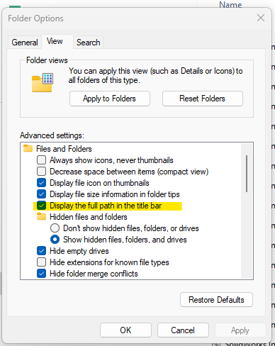 @josh , would you mind clarifying what you mean? Do you mean you want the whole file path in the tab instead of just the folder name, or in the line just below it in the active sheet? I’m asking because I’ve always seen the whole file path in that space (assuming the window is large enough), without changing anything in options.